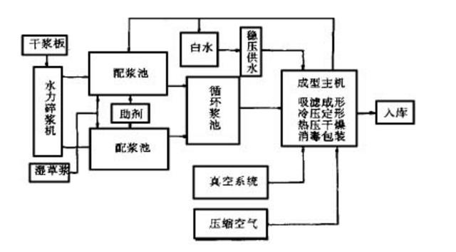 生產(chǎn)線是由兩臺(tái)真空模塑成形主機(jī)系統(tǒng)和與主機(jī)規(guī)模相適應(yīng)的輔助系統(tǒng)所組成, 其生產(chǎn)工藝如下:原料甘蔗漿(干漿或濕漿) 制漿,配漿,輸漿,成型主機(jī)(注漿、吸濾成形、熱壓定型、真空熱干),切邊,檢驗(yàn),成品消毒、包裝,入庫(kù)。
